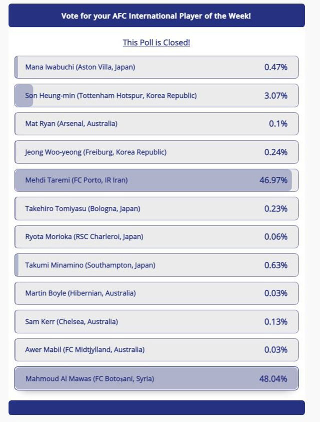 فارس: سایت کنفدراسیون فوتبال آسیا یک نظرسنجی برای انتخاب بهترین لژیونر هفته آسیا برگزار کرده بود که در نهایت امروز به پایان رسید تا مهدی طارمی مهاجم ملی پوش کشورمان و عضو باشگاه پورتو در رده دوم بهترین لژیونر هفته قرار گرفت.