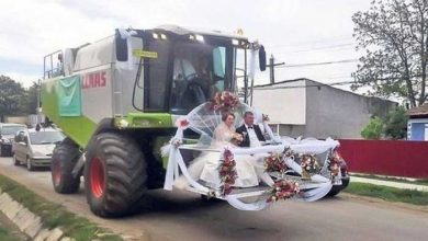 توریسم آنلاین:این زوج نسبتا جوان روسی برای دیده شدن این گونه به خانه بخت می روند؛با کمباین تزیین شده!