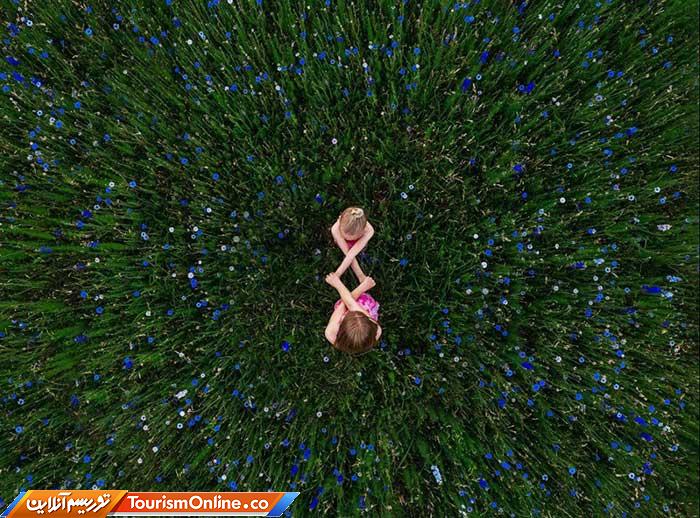 توریسم آنلاین:خواهران در یک روز بهاری در تگزاس در زمینه گلهای وحشی بازی می کنند. مادر آنها با استفاده از پهپاد عکس را ضبط کرد.