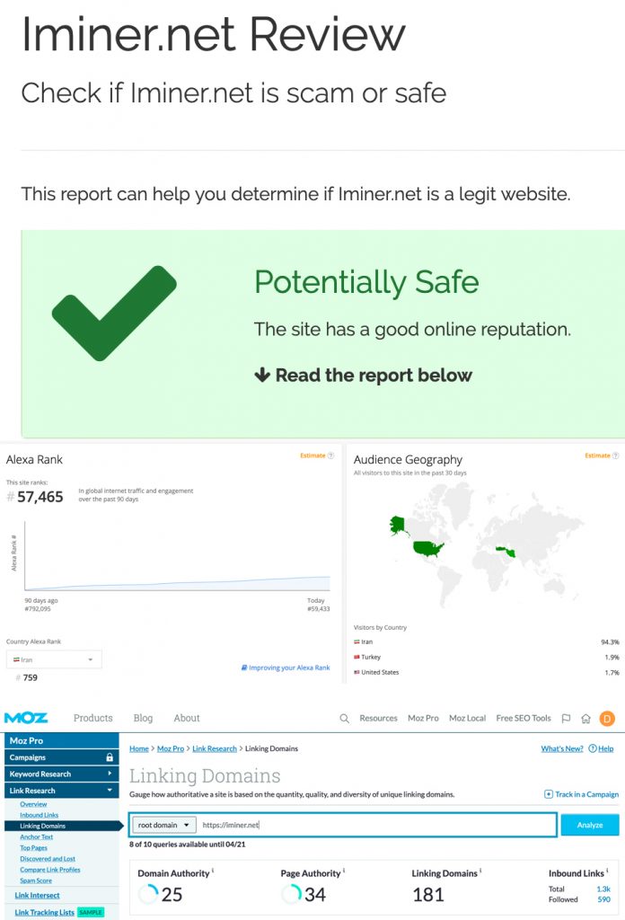 شما می توانید دامنه سایت iminer.net را در الکسا alexa.com/siteinfo/iminer.net بررسی کنید که دامنه iminer.net جزو 500 وب سایت برتر و پربازدید ایران است، اعتبار گواهی نامه SSL این سایت ۵ ساله است و همچنین میزان اتوریتی آن را در سایت moz.com مشاهده کنید و یا در سایت www.scamfoo.com/site/iminer.net این وب سایت را بررسی کنید .