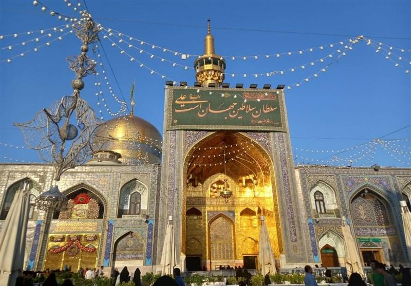 تمام صحنها و رواقهای حرم مطهر رضوی از کتیبهها و پرچمهای رنگی پر شده است. همهجا چراغانی شده و جشنواره نور و گل و گلاب راه افتاده است.