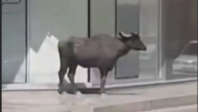 گاومیش سرگردان در روزهای خلوت کرونایی در ورودی مرکز خرید بالای شهر اهواز/فیلم