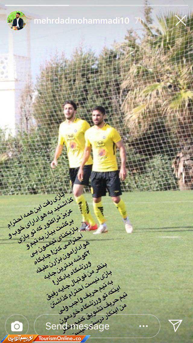 مهرداد محمدی ستارۀ تیم فوتبال سپاهان که بازیکن محبوبی در اصفهان به حساب میآید، از اتفاقات تبریز به شدت ناراحت بهنظر میرسد. او با انتشار عکس زیر در اینستاگرام به شرایط برگزاری این مسابقه و تفاوت آن با دیدار رفت در اصفهان واکنش نشان داده است.