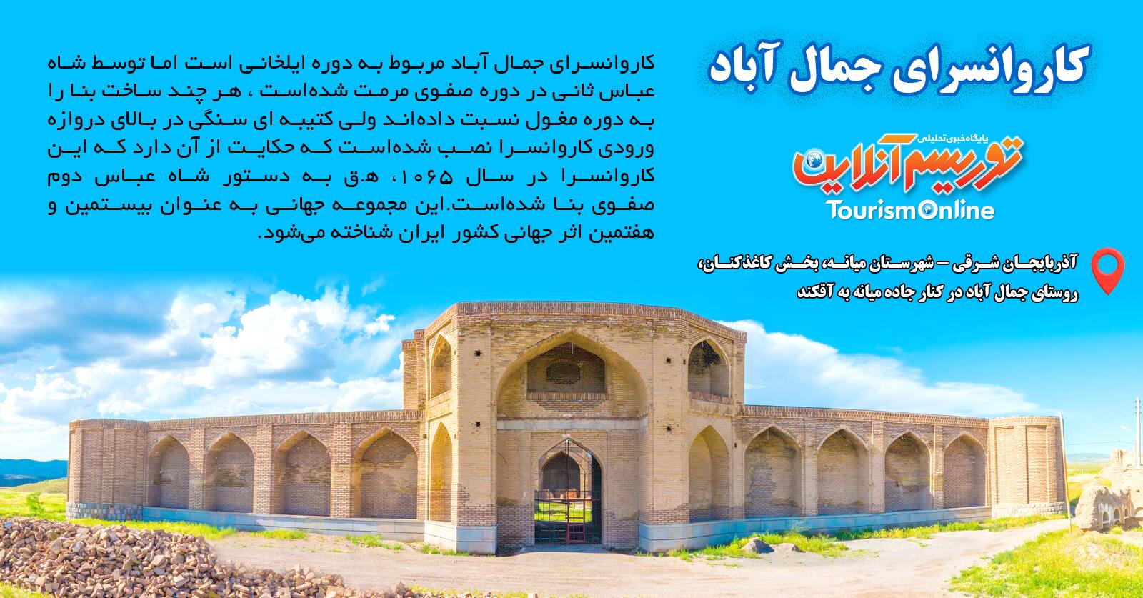 توریسم آنلاین: کاروانسرای جهانی جمالآباد در روستایی به همین نام در بخش کاغذکنان شهرستان میانه از جمله آثار فاخر و ارزشمند دوره ایلخانی به شمار می رود که در مسیر جاده قدیم میانه – زنجان قرار دارد و جزو کاروانسراهای برون شهری از نوع چهار ایوانی است که به صورت یک طبقه ساخته شده است.موریس دوکوتزبوئه، شوالیه ژان شاردن، جوانی فرانچسکو جملی کارری و ژان باتیست تاورنیه از جمله جهانگردان بنام و مشهور اروپایی هستندکه هر کدام در سفرنامه های خود از کاروانسرای جمال آباد نام برده و از آن به عنوان یکی از بهترین مکان های استراحت مسافران و جهانگردان یاد کرده اند.