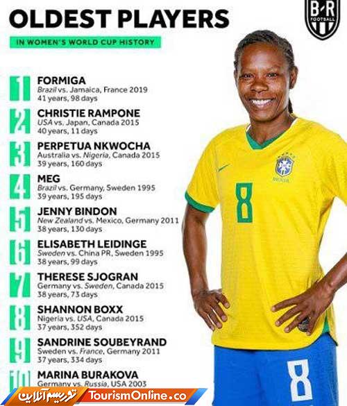 خبرآنلاین: مسن ترین بازیکن تاریخ جام جهانی زنان، یک بازیکن ۴۱ ساله است. فورمیگا هافبک تیم ملی فوتبال زنان برزیل با حضوردر دیدار دیروز برزیل مقابل جاماییکا با ۴۱ سال سن به مسن ترین بازیکن تاریخ جام جهانی زنان تبدیل شد.