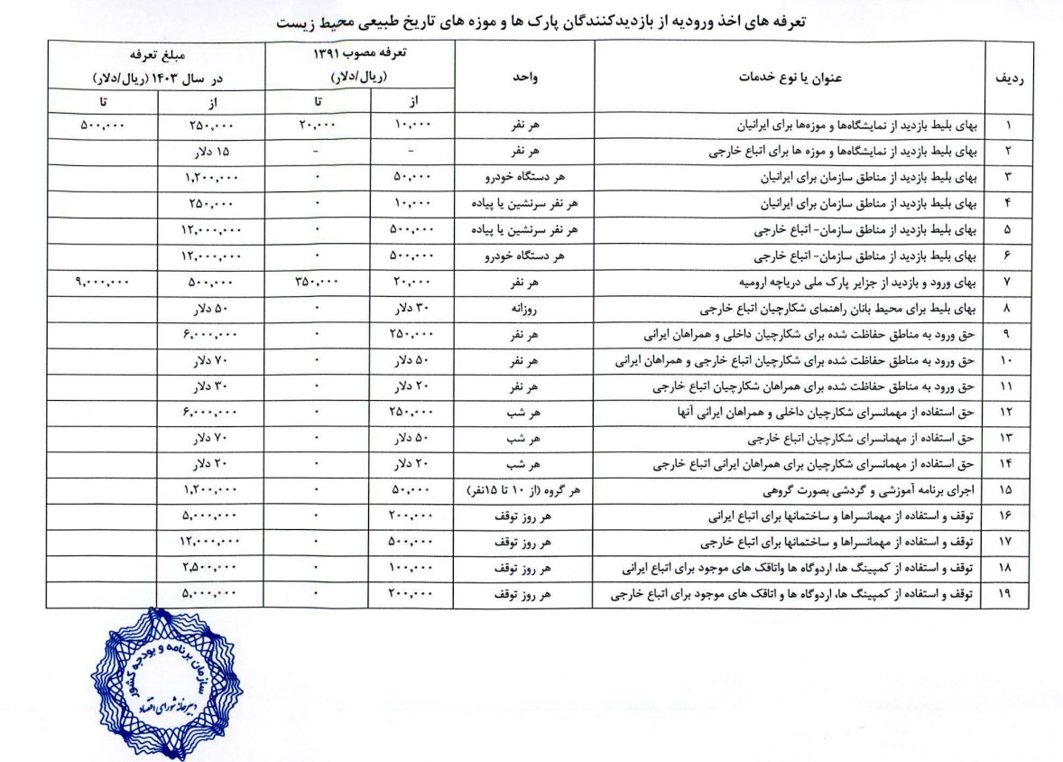 رئیس سازمان برنامه و بودجه نرخ های جدید بازدید از پارکها و موزههای ملی وابسته به سازمان حفاظت محیط زیست برای گردشگران داخلی و خارجی را ابلاغ کرد.