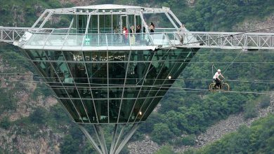 توریسم آنلاین : دوچرخه سواری یک مرد نترس روی زیپ لاین در مراسم افتتاحیه پل شیشه ای روی دره داشباشی…